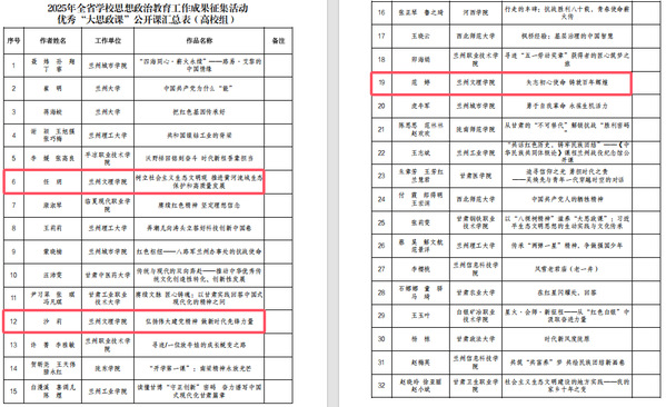 近日,2025年全省学校思想政治教育工作成果征集活动优秀作品名单公布。我校多项教师成果入选,体现了学校在思想政治教育教学、研究与实践创新方面的扎实成效。本次成果征集活动旨在深入贯彻习近平总书记关于思政课建设的重要指示精神,推动大中小学思政课一体化建设。经各地各校推荐、专家评审与公示,我校任玥老师主持的《树立社会主义生态文明观推进黄河流域生态保护和高质量发展》、沙莉老师主持的《弘扬伟大建党精神做新时代先锋力量》、范婷老师主持的《矢志初心使命铸就百年辉煌》入选优秀“大思政课”公开课;陈兵建、王晗睿老师《新时代地方非民族高校铸牢中华民族共同体意识教育创新路径研究——以兰州文理学院为例》,董银雪老师的