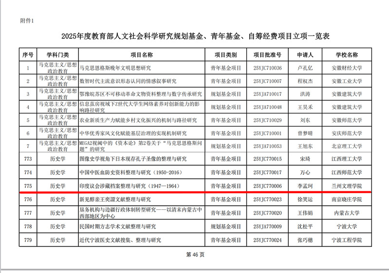 近日,教育部社会科学司正式公布2025年度教育部人文社会科学研究项目立项结果(教社科司函〔2025〕16号),我校文学院李孟珂博士申报的《印度议会涉藏档案整理与研究(1947-1964)》获批立项。撰稿:薛亚娣 通讯员:王雅儒 审核:林沛审校:闫一丹 苏文龙