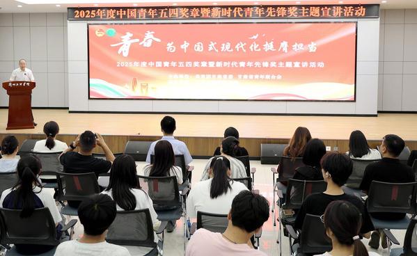 为深入学习宣传贯彻习近平总书记重要讲话精神和给新疆谢依特小学戍边支教西部计划志愿者服务队队员重要回信精神,充分发挥先进典型在青少年思想政治引领中的积极作用,团结带领我校团员青年牢记习近平总书记嘱托,在中国式现代化甘肃实践中挺膺担当。6月25日下午,由共青团甘肃省委、甘肃省青年联合会主办,我校团委承办的“青春为中国式现代化挺膺担当”——2025年度中国青年五四奖章暨新时代青年先锋奖主题宣讲活动在文昌楼多功能厅举办。
