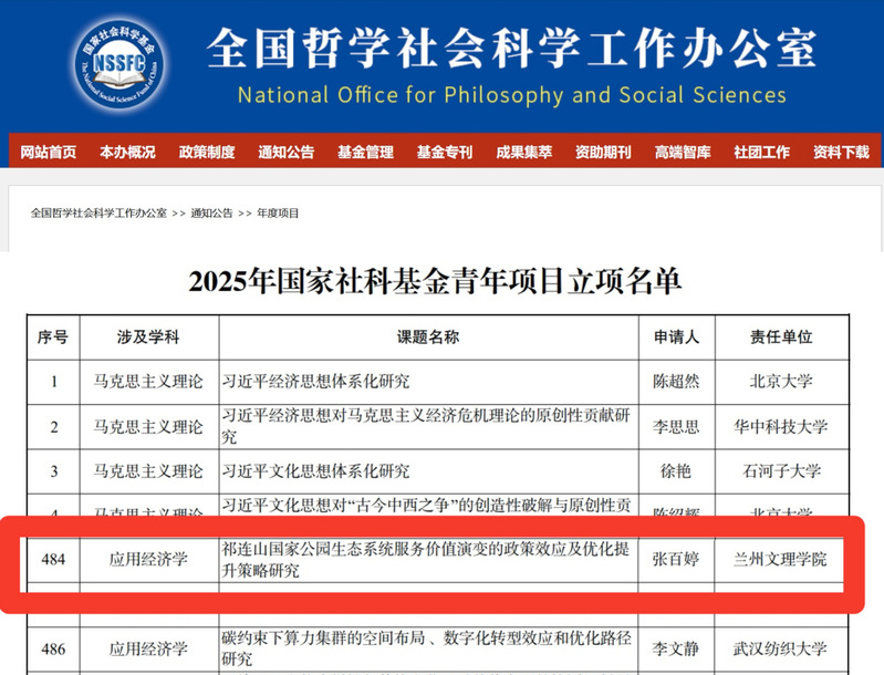 9月5日,全国哲学社会科学工作办公室正式公布了2025 年度国家社会科学基金项目的评审结果。我校旅游学院张百婷博士主持的《祁连山国家公园生态系统服务价值演变的政策效应及优化提升策略研究》项目成功获批国家社会科学基金青年项目,实现了我校在该类别国家社科基金项目上的突破。