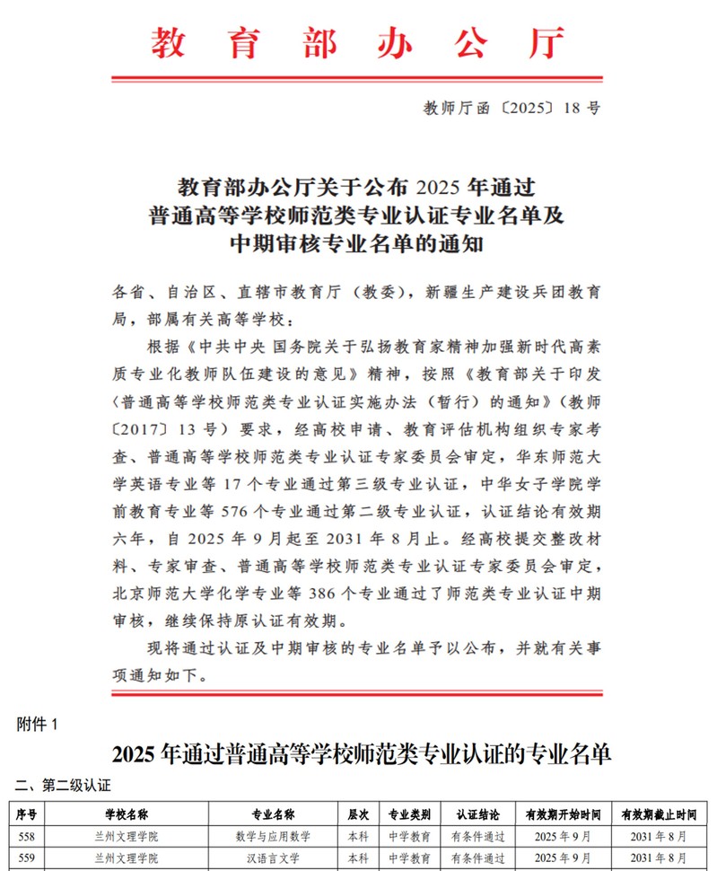 近日,教育部办公厅发布《关于公布2025年通过普通高等学校师范类专业认证专业名单及中期审核专业名单的通知》(教师厅函〔2025〕18号),我校数学与应用数学、汉语言文学两个专业通过师范类专业第二级认证。截至目前,我校已有3个师范专业通过教育部师范类专业第二级认证且在有效期内。