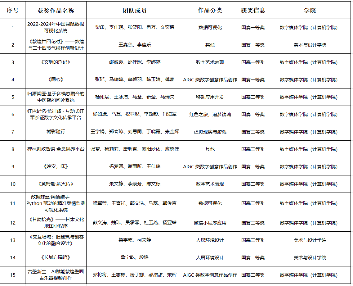 自赛事启动以来,学校高度重视,数字媒体学院(计算机学院)积极组织学生参赛。参赛作品涵盖"民族文化创新表达"、"移动应用开发"、"数据可视化"、"乡村振兴、科技赋能"等多个赛道,充分展现了我校学生将艺术创意与前沿技术相融合的创新实践能力。