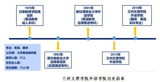 外语学院前身为甘肃教育学院英语系,是兰州文理学院最早设立的院系之一,其发展历程清晰展现了学院在外语教育领域的深耕与拓展:1978年为甘肃教育学院英语系(英语教育成人本科),1992年更名为原甘肃联合大学应用英语系(应用英语专科),2001年转型为新甘肃联合大学外语学院(英语教育本科专业、应用英语专科),2013年定名为兰州文理学院外语学院,2025年已形成开设英语、翻译2个本科专业,涵盖公共课大学英语教学的格局,招生规模稳定在70人/年,现有在校本科生254人。
