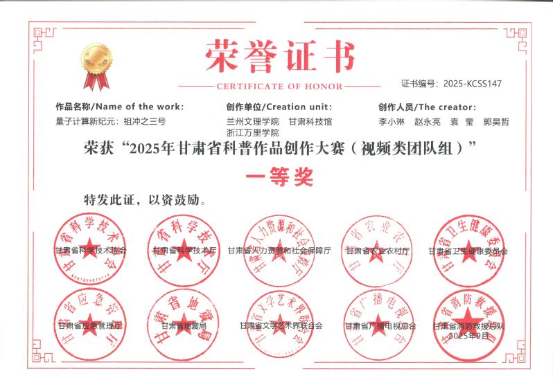 近日,甘肃省科学技术协会公布了2025年甘肃省科普作品创作大赛获奖结果,我校艺术职业学院教师李小琳老师主导创作的科普视频作品——《量子计算新纪元:祖冲之三号》,荣获大赛“视频类团队组一等奖”。此次获奖充分展示了我校教师在科学普及与知识传播方面的卓越能力与创新精神,是我校科学技术协会推动科普工作、提升社会服务效能的重要体现。撰稿:王雅儒 通讯员:王雅儒 审核:林沛审校:闫一丹 苏文龙